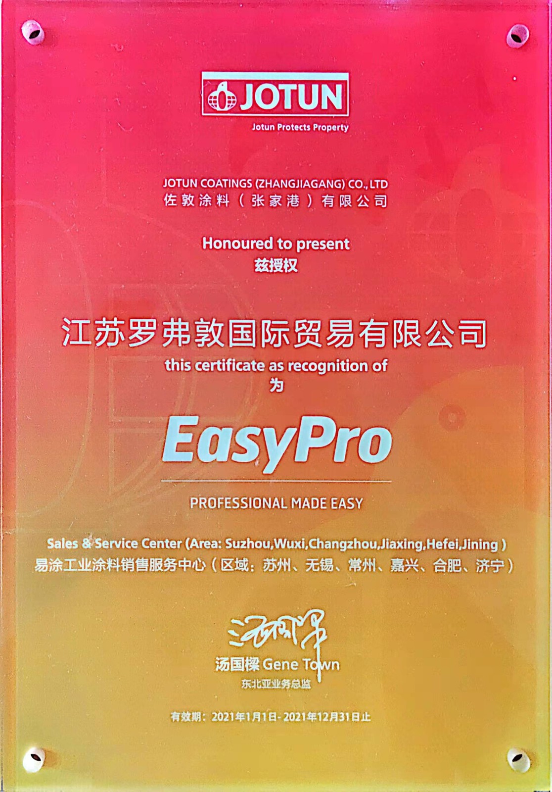 江苏罗弗敦国际贸易有限公司是一家有20年专业销售及售后服务经验的油漆公司。本公司为世界品牌"佐敦漆"苏南、上海、杭州、嘉兴、山东、安徽地区总代理,本公司也是佐敦工业漆在中国区首个实体门店批发总代理商。目前本公司已是国内外1000多家企业长期指定供货商。